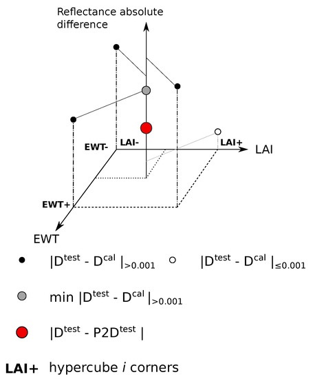 with i the hypercube identifier and j the hypercube corner identifier. This ratio was designed to compare the reflectance distance between P2D and DART at the hypercube center (maximum error) with the reflectance distance between the hypercube center and corners obtained through DART. A value close to 100 indicates that the P2D error is similar to the smallest difference between the hypercube’s center and corners, while a value close to 0 indicates that the P2D error is negligible. An illustration of the P2D validation methodology is presented Figure 5. An E value lower than 50 indicates that the P2D approximation is closer to the hypercube center than the corners. A condition that should be non-negligible (>0.001 when reflectance range is 0 to 1) was used as variables do not necessarily have an influence at all wavelengths, which could lead to close to zero differences between some corners and the center and make E diverge erroneously.