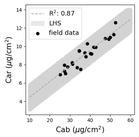 While final estimation performances obtained in this study are similar or better than those obtained by Miraglio et al. [30], there are two main differences between the two methodologies: The first one is that the previous study used PROSPECT-5 and not PROSPECT-D: the principal differences between PROSPECT-D and -5 are the introduction of anthocyanins and the modification of the pigments specific absorption coefficients (SAC) at various wavelengths [34]: the chlorophylls SAC were lowered over the 0.45–0.65 m interval and increased over 0.65–0.7 m, and the carotenoids SAC were increased over the 0.45–0.55 m interval. The second difference is the sampling scheme, which was previously a regular grid over the variables’ variation ranges, meaning that no correlation between and Car, such as the one visible Figure 6, could be modeled. While this was not critical for estimations, as the high values in Table 5 show, this limited the number of possible VI to use for Car estimations. Introducing the relationship between and Car when building the LUTs allowed to use VI for Car estimations, which proved to be more adequate. This relationship also helps to reduce the unnecessary cases in the LUTs, as low -high Car cases (and vice versa) are unrealistic and could bring confusion when doing the inversions.