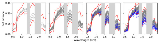 LUT reflectances and AVIRIS-C reflectances at validation pixels for each date (from left to right: June 2013, September 2013, June 2014, June 2016). In red, reflectance boundaries of the associated LUT, in gray, AVIRIS-C reflectances. In blue, AVIRIS-C reflectances from mixed QUDO-PISA validation pixels.