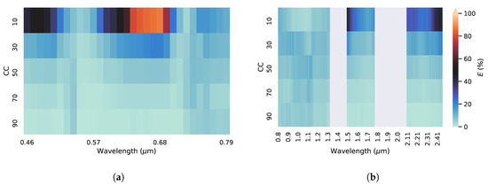 Figure 8 and Table 6 show the evolution of the E ratio over the CC and wavelengths. In the visible, all wavelengths are well approximated by P2D for CC ≥ 30%, with the highest E value being 21% at 0.68 m and 30% CC. While for 10% CC, the green and NIR are also well approximated (E < 50%), this is not the case for the blue and red regions where E can be above 50%. In the SWIR, for 10% CC E values are considerably below 50% for < 1.8 m. However, higher values are found at higher wavelengths and the maximum, 46%, is obtained at 1.49 m. Estimations with either DART or P2D LUTs only used the CC ≥ 30% cases to avoid uncertainties.