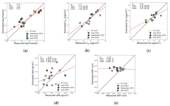 Figure 9 compares estimated and field values for the various estimates of this study when using the best performing methods identified in Section 3.4. Gap Fraction estimations present both a high and a low RMSE (0.78 and 0.1, respectively). While it appears that one of the June 2014 mixed plots (yellow) was overestimated, other mixed plots present a similar behavior as pure QUDO plots. Similar behaviors are found for and Car: most of the points seem to follow the first bisector, and the point with the highest and Car values is slightly underestimated. RMSE errors in both cases remain low (4.14 and 1.05 g/cm2, respectively). No trend between estimations and field data could be found for either LMA and EWT (their respective are 0.14 and 0.01) and RMSE of g/cm2 and cm are obtained.