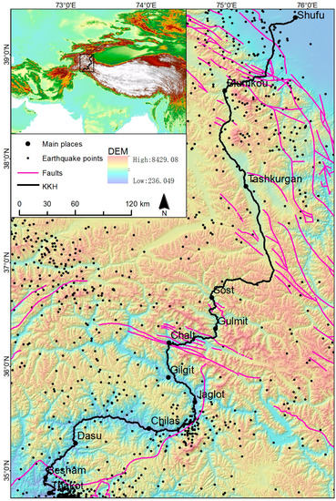 Location of the study area and distributions of faults, the KKH, earthquake sites, and the major settlements. (The Digital Elevation Model (DEM) data were provided by the International Scientific and Technical Data Mirror Site, Computer Network Information Center, Chinese Academy of Sciences, http://www.gscloud.cn; faults were provided by China Geological Survey; the earthquake sites were from earthquake database supplied by United States Geological Survey (USGS), and the sites with magnitude above 4 on the Richter scale since 2000 were selected, https://earthquake.usgs.gov/earthquakes).
