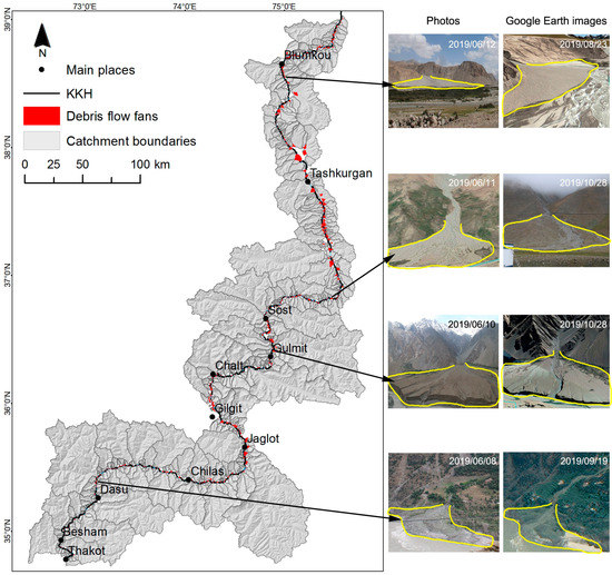 Results of the identification results of debris flow accumulation fans along the KKH, and comparison of Google Earth images and field photos of typical debris flow fans. (The photo was taken by Xiaojun Su from the field survey).