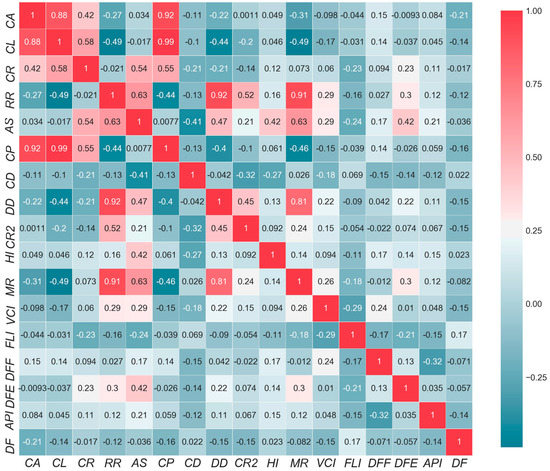 For some models, strongly correlated parameters contain some degree of redundancy, and substantial collinearity will lead to model instability. In this study, a parameter correlation matrix heat map (Figure 5) was calculated based on the Seaborn Python visualization package. It was found that there were several pairs of variables which were highly correlated; for example, the following correlation coefficients were obtained: 0.92 for CA vs. CP; 0.88 for CL vs. CA; 0.99 for CL vs. CP; 0.92 for RR vs. DD; and 0.91 for RR and MR. Therefore, CL, CP, and RR were eliminated.