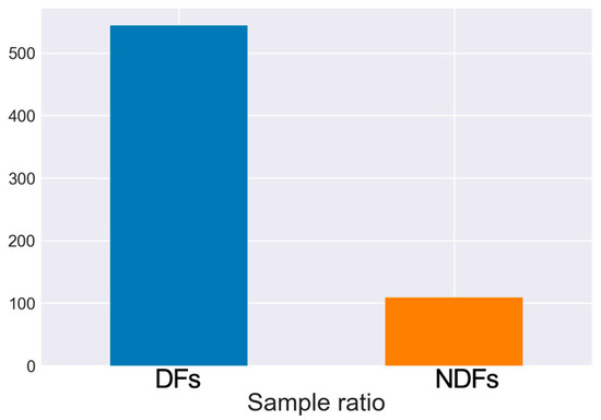 For the sample data collected in this study, the ratio of DFs to NDFs is 5:1 (Figure 6). This data imbalance will cause the learning machine to pay more attention to the classifications with DFs and hence, obtain an inaccurate model. In this study, SMOTE (the synthetic mineral oversampling technique) [54] was used to increase the number of NDF samples. This method randomly selects a nearest neighbor sample B from A (a sample in NDFs), and then, randomly selects a point C from the relationship between A and B, as a new minority sample. After resampling, the sample size of NDFs was increased to 544, and the ratio of NDFs to DFs was 1:1.