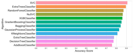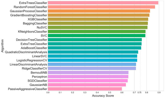 The training data in the cross-validation dataset were used to train the initial model. The models were then sorted according to the average accuracy score (ACC) of the test data in the cross-validation dataset (Figure 8). The ACC (Formula 3) indicates the rate of correct assignment of all samples participating in the modeling (Table 3). It is evident from Figure 8 that the overall fitting effect of the integrated model is better than that of the other models. The highest score was achieved by Extra Trees, followed by Random Forest, Gaussian Process, Gradient Boosting, and XGBoost.