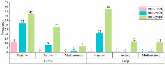 Temporal trends of the application of different detection systems for forest and crop LAI estimation from 1990–2019.