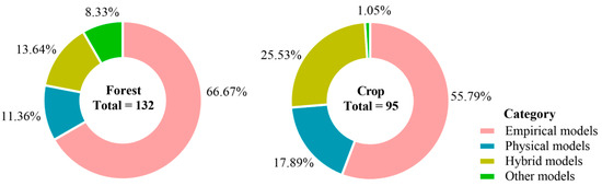 Distribution of different model types for forest (left) and crop (right) LAI estimation.