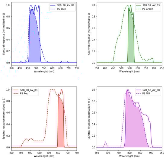 Comparison between PlanetScope (PS) (group 0cxx or 0dxx) and S2 (A) spectral response functions for RGB and near infrared (NIR).