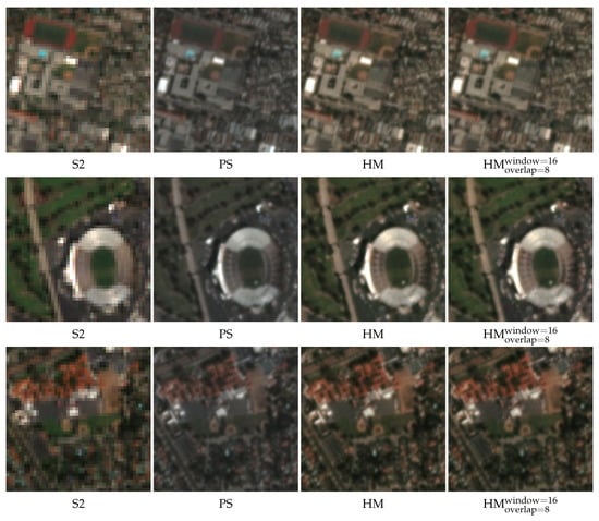 As a result, we will end up with a PS tile better matching the reflectance values of the S2 tile. However, although the tile size is relatively small, when applying HM to the whole tile a small color mismatch can still be appreciated. To solve this, our proposal is to apply HM in small windows of pixels with an overlapping among them (of 50%, that is, 8 pixels). Overlapping implies that for most of the pixels four values will be estimated, in these cases, the average value is then computed. Notice that the smaller the window size is, the better the reflectance matching is. However, there is a point where using a very small window size leads to a resolution loss, which should be avoided. Figure 6 shows the effect of applying HM to PS with S2 as a template. Both the case where HM is applied to the whole tile and the case where HM is applied by windows () with overlapping (8 pixels) are presented. Notice that 16 pixels refer to the window size in S2 tile (equivalent to 64 pixels in the PS patch of 4× and 32 pixels in that of 2×).