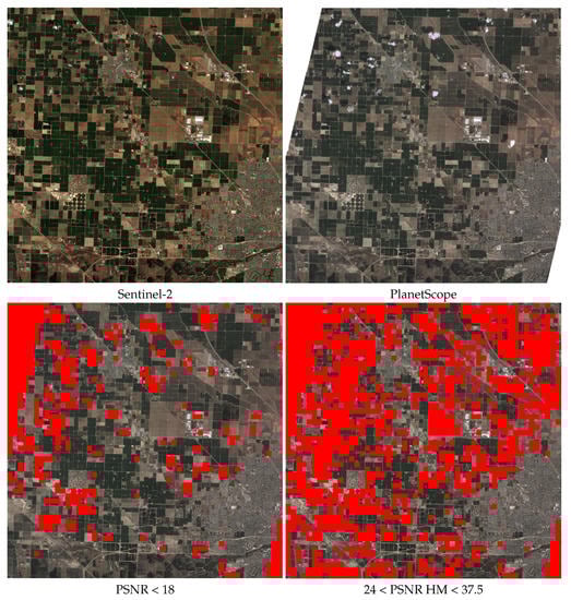 The thresholds were established by visual inspection. SSIM was also considered for filtering, but the minimum quality required was always fulfilled by the patches passing the previous filters and hence, we decided to avoid this additional step. The two filtering steps can be explained as follow. The former is devoted to the elimination of patches where clouds or cloud shadows are present. In those cases, validating after HM can lead to high PSNRs, since the HM can completely change the appearance of the PS image making it very light or dark. The latter is devoted to remove other artifacts and patches that are too similar to be useful. This way, the quality of the dataset is ensured, avoiding those patches that do not provided any knowledge for the network. The result of applying this validation process to an image of the dataset (Shafter area) is presented in Figure 7.