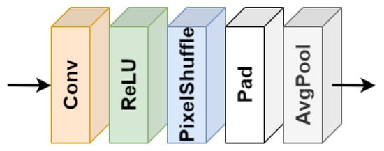 With respect to the architecture of EDSR, some updates apart from using other loss functions are introduced. These modifications focus on eliminating checkerboard patterns in the output image. The first one is to consider ICNR [] initialization for Pixel Shuffle layers. The second one is to consider the proposal in Reference [], which consists of blurring the output of the Pixel Shuffle layer with an average pooling operation (window size of ). The final scheme of the Pixel Shuffle layer used in this work is presented in Figure 9. Finally, as explained in Section 2.2, the authors of EDSR proposed to use a residual scaling factor (0.1) when training the largest versions of EDSR. After several preliminary experiments, we found that using this residual scaling factor also in EDSR8 led to better performance. Hence, we will consider it for all the experiments.