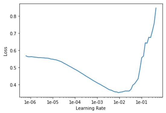 For training, the guidelines given by Leslie Smith in References [,] are followed, which usage has been extended thanks to fast.ai library []. There are two key points in this guidelines: the usage of the learning rate finder and the one-cycle policy for learning. Both are related and aimed at learning accurate models faster. The first one helps finding the proper learning rate, which makes a huge impact in what the network learns. The second one refers to make the learning rate vary in a specific manner so that the learning is more effective. Hereafter, we briefly recall how they work, but we refer the reader to the original papers, References [,] and the fast.ai book for more details []: