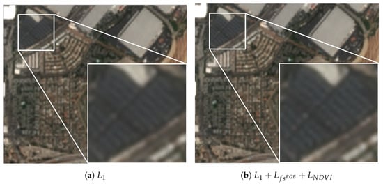 - Feature and style losses for infrared band: Feature and style losses strongly depend on a pretrained VGG16 network. This network is usually pretrained with Imagenet [], which consists of standard RGB images. Hence, this network cannot be straightforwardly applied to images with RGBN bands. In Reference [], we proposed to divide the loss into two parts: RGB and NIR losses, each part being composed of three components (pixel, feature and style losses). The RGB loss is computed as usual considering only RGB bands. For NIR loss, this band is converted into a RGB image by copying the same band into the three channels. This way, VGG16 network can be applied and the corresponding feature and style losses computed. Finally, both parts are combined scaling the losses so that all bands have the same importance (the parameters for doing so are specified in Section 4.3). Notice that VGG16 may not be well suited for NIR band, although it is only used for feature extraction. Hence, we will also test this loss function removing the feature and style losses from the NIR part to check which option provides the best result.