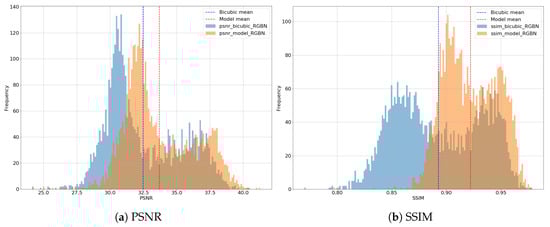 Histograms of the PSNR and SSIM metrics obtained for the tiles in the test set (bicubic interpolation and the proposed EDSR32 model).