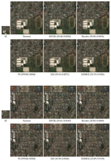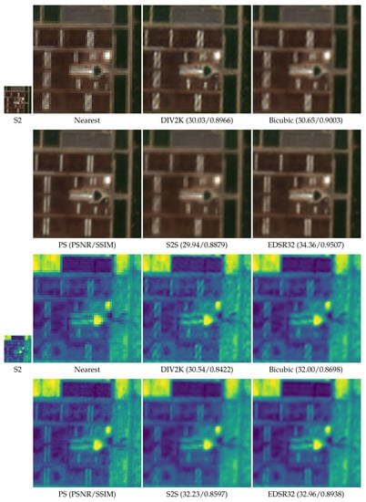 - Comparison with previous models: The proposed methodology has clearly outperformed other models for S2 super-resolution. The well-known bicubic interpolation (a resampling method) has shown better performance than networks learned only with S2 images or using standard RGB images. Hence, the necessity for learning specific networks should be highlighted.