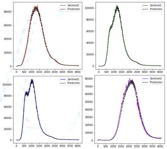 The goodness of the proposed methodology has been evaluated in the previous section. However, we have not carried out any validation of the reflectance values provided by the super-resolution. After super-resolving an image, we want to maintain the spectral radiometry with respect to the original S2, so that the same analyses can be carried out, but with greater details. To analyze whether these values are coherent with those provided by S2, we compare the histograms of a complete S2 image with the one obtained after its super-resolution with the proposed model (EDSR32). The histogram for each RGBN band is presented in Figure 16. For the sake of simplicity, the pixel counts (Y-axis) of the prediction are divided by 16, since 16 times more pixels are present in the super-resolved image.