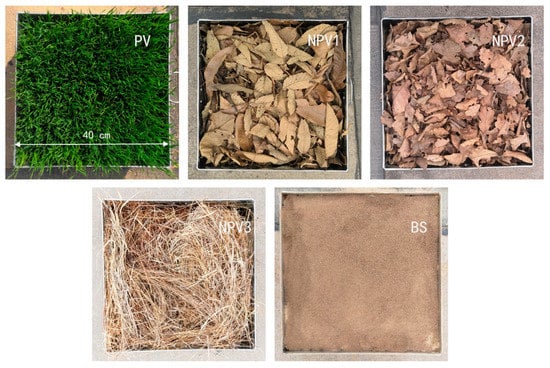 The experimental boxes were designed with the size of 40 × 40 × 20 cm (length × width × height) as shown in Figure 1. Three sample boxes contained the three types of NPV samples, one for the bare soil sample, and another for the PV sample (wheat, Triticum aestivum L.). The wheat was planted inside the box with the density of 4–5 seeds per cm2, when it grew up to cover 100% of the sample box about two weeks and measured as the PV sample.