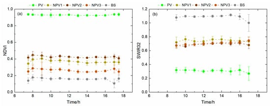 The hourly variation of NDVI among the five FVC objects was shown in Figure 5a; Figure 5b represents the change in SWIR32 index hourly for five objects. From Figure 5a, it can be seen that the NDVI index of PV was significantly high, with a range of 0.921–0.935 over time in the period of 7:30 a.m.–17:30 p.m. The NDVI index of NPV fluctuated from 0.242 to 0.447, and the NDVI index of BS changed around 0.104 to 0.177 over the time. The NDVI values of PV could be much easier to differentiate than that of NPV and BS which made it effective to detect green vegetation from other objects.