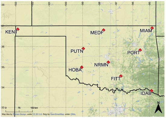 - Oklahoma Climatological Survey. Map of Oklahoma Climate Divisions with Mesonet Stations. Available online: https://climate.ok.gov/index.php/climate/map/map_of_oklahoma_climate_divisions_with_mesonet_stations/oklahoma_climate (accessed on 9 July 2020).