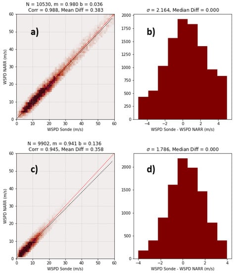 As shown in Figure 2a, the winter NARR wind speeds had a high Pearson correlation of 0.99 with the sounding wind speeds. The mean difference between the wind speeds was 0.38 m s−1. In addition, 9963 out of 10,530 data points were within two standard deviations. The median difference was 0.00 m s−1, and the standard deviation was 2.16 m s−1 as shown in Figure 2b.