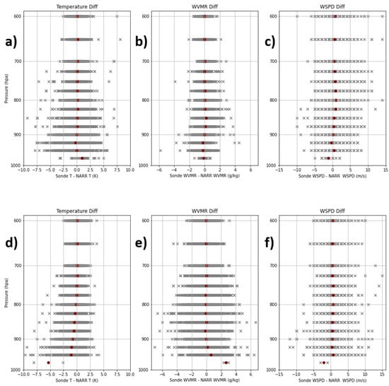 The differences in temperature (a), water vapor mixing ratio (b), and wind speed (c) for meteorological winter. Each x marks a difference, with the red symbol representing the mean. (d–f) are as (a–c), but for meteorological summer. differences are plotted with respect to atmospheric pressure on a logarithmic scale.