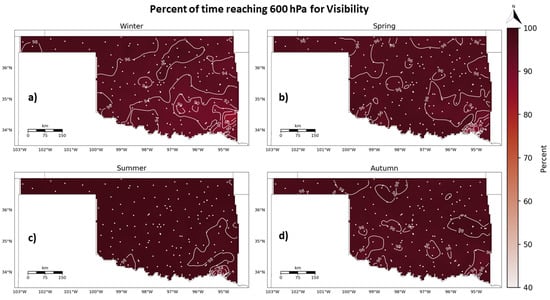 The fractions of successful hypothetical flights of UAS profiles given a minimum visibility of 4828 m in (a) winter, (b) spring, (c) summer, and (d) autumn. Each dot represents an Oklahoma Mesonet Site.
