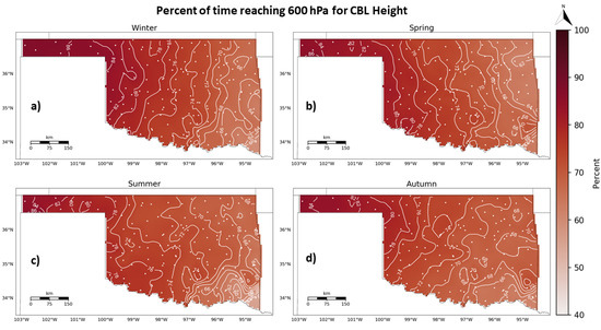 Oklahoma has dynamic weather, and the wind and cloud conditions change with each season. Therefore, the seasons were analyzed individually. The meteorological seasons are defined as winter (December, January, and February), spring (March, April, and May), summer (June, July, and August), and autumn (September, October, and November). Although the WxUAS considered in this study are not built to withstand extreme weather conditions (i.e., thunderstorms or freezing rain), their utility in observing the ABL leading up to extreme events shows promise in improving numerical weather prediction model forecasts [,,]. For these reasons, it is important to characterize the hypothetical performance of WxUAS in “base state” conditions. Certain limiting parameters were used to determine the fractions of successful hypothetical flights of WxUAS sampling with respect to each season over the period of investigation. For this study, a WxUAS flight is considered to be successful if a hypothetical UAS would be able to reach a given pressure level based on consideration of the atmospheric conditions and FAA regulations. The FAA has set restrictions on the conditions in which UAS are allowed to fly. Most notably, when operating under Visual Line Of Sight (VLOS) restrictions, for example, a surface visibility of three statute miles (4828 m) is required and UAS must stay below 500 feet (152.4 m) of the CBL height []. The same rules apply when piloted aircraft are operated under Visual Flight Rules (VFR) in certain airspace classes. Moreover, we must consider the wind speed tolerance of a particular UAS. The CopterSonde, a UAS developed by the Center for Autonomous Sensing and Sampling (CASS), currently has a wind tolerance of 22 m s−1, but this threshold is evolving over time with advancements in the CopterSonde design []. We chose the CopterSonde as a representative rotary-wing UAS as it has been extensively tested and experimentally utilized by CASS. Therefore, a wind tolerance of 25 m s−1 was used for this study. The study focuses on the extent these parameters affect the fraction of successful hypothetical UAS flights for each meteorological season averaged over the period of investigation. The pressure level considered for flight success was set at 600 hPa (around 4000 m AMSL) because around 4000 m AMSL is the upper bound altitude we expect is necessary to reach to capture the thermodynamic and kinematic structure of the ABL. Each parameter was analyzed individually to determine the seasonal fraction of successful hypothetical flights for each mesonet station only accounting for that variable. This was to determine the amount each parameter restricted the number of successful flights. Next, the parameters were combined to determine the overall fraction of successful hypothetical flights for each season. Once the fractions were calculated for each mesonet site, the data were interpolated across the state of Oklahoma using the Scipy non-uniform griddata function []. Table 1 shows the thresholds that result in unsuccessful hypothetical flights.