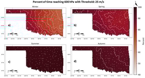 The fractions of successful hypothetical flights of UAS profiles given a maximum wind speed tolerance of 25 m s−1 for (a) winter; (b) spring; (c) summer; and (d) autumn. Each dot represents an Oklahoma Mesonet Site.