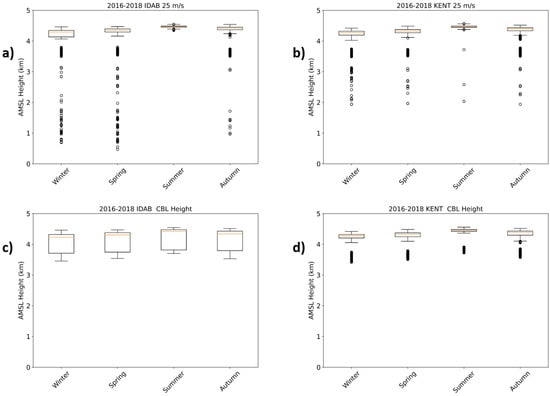 Box plots showing the maximum heights AMSL reached with only the wind speed threshold taken into consideration are shown in Figure 8a,b and box plots of the maximum heights AMSL reached considering only the CBL height threshold are shown in Figure 8c,d. For the wind speed box plots, the maximum height AMSL outliers reached below 1 km in every season except the summer for IDAB, and the lowest maximum height AMSL outliers were about 2 km for KENT. Note that outliers are defined here as points greater than and less than , where and represent the first and third quartiles, and is the interquartile range. Although there were more outliers for the IDAB site, the median values were roughly the same for both sites with values above 4 km. For the IDAB site, the interquartile ranges increased for the CBL height with the lower bound below 4 km for all seasons. However, the medians were still all above 4 km, which follows from the fraction of successful hypothetical flights percentage. The lower tails were all above 3 km or 700 hPa. For the KENT site, the CBL height interquartile ranges were much smaller than that of IDAB. All of the failures were shown as outliers and these values were all between 3.5 km and 4 km or between 650 and 600 hPa. The lack of outliers for the IDAB site compared to KENT when considering CBL height is likely related to a larger interquartile range of ASML maximum heights at IDAB thereby increasing the threshold to determine the presence of outliers.