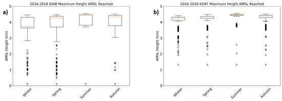 Next, we examine the box plots of the maximum heights AMSL reached at the IDAB and KENT sites with all thresholds imposed, including visibility. These are presented in Figure 9a,b. The circles at 0.11 and 1.32 km indicate the visibility less than 4828 m for the IDAB and KENT sites respectively, so the UAS would not be able to leave the ground. For the IDAB site, the median for winter dropped below 4 km, which again demonstrated a fraction of successful hypothetical flights of below 50%. The interquartile ranges for all seasons were about 1 km indicating a broader distribution of altitudes. For the KENT site, the interquartile ranges for all seasons were larger compared to the ranges for wind speed and CBL height alone. All medians were above 4 km.