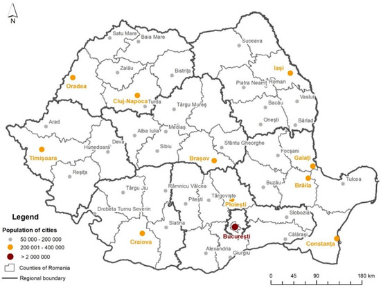 With an important rural population (around 48% of the total population), the major municipalities of Romania are the leading places for innovation and smart city solutions, connecting large rural hinterlands with the global flow of capital, goods, and information [46,47].