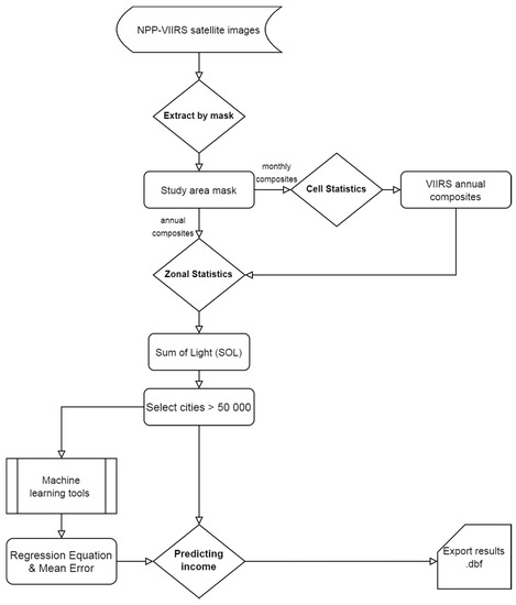 In order to calculate the sum of light (SOL) for each individual administrative territorial unit, the “Zonal Statistics as Table” tool was used. The “Zonal Statistics as Table” tool calculates statistics (sum in our case) on the values of a raster within each administrative territorial unit. The data preparation process involves the following processes: (1) masking the downloaded raw monthly VIIRS satellite images (vcmslcfg layer) using the limit of the study area (country limit in our case); (2) calculating an average annual pixel brightness for the 12 masked monthly images, resulting a single nighttime light image; and (3) summing up the pixel values of the image for each territorial administrative unit, resulting the sum of light (SOL) values for each city. In case of annual images, step (2) was skipped. The EO-Incity tool in the first part of the model masks the study area and calculate the SOL, using as input data the annual or monthly VIIRS satellite images. In the second part of the model it uses as input parameters the calculated SOL data and the equation resulting from running the algorithm within MATLAB for the estimation of the income. (Appendix A).