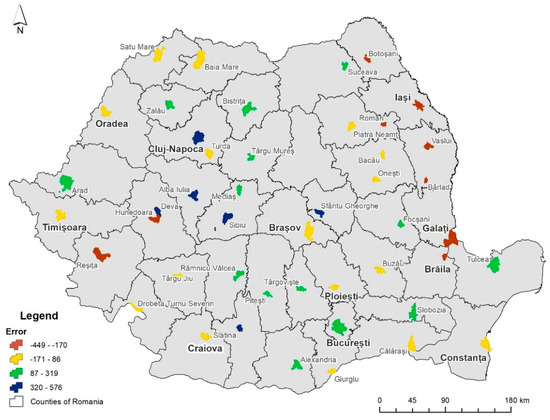 Taking into consideration the values of the regression values, the highest negative differences (overestimation) are noticed for the cities in the east of Romania (Figure 3). The possible source of error is the overestimation of the population due to the practice of the citizens in the Republic of Moldova to declare their presence in these cities (Vaslui, Bârlad, Iași) to obtain Romanian citizenship [54,55,56]. As for the positive difference (underestimation), the largest differences were noticed in Slatina, where there is a big electricity consumer, the largest aluminum producer in Europe, Alro SA, which also generates higher SOL values. In the case of the cities of Sibiu, Deva, Cluj-Napoca, and Sfântu Gheorghe, a possible explanation would be the underestimation of the resident population or/and informal economy (see for this subject Ghosh et al. [33]). In the case of Cluj-Napoca—one of the most important academic centers in Romania—another explanation would be the large number of students present, but registered as residents elsewhere. The positive difference in Cluj-Napoca and other cities like Sibiu and Brasov may also be explained by tourism. Bluhm and Klaus [57] pointed out that stable lights may underestimate income in high-density places, therefore they recommend using top-coding correction. In our analysis we have found several cities of similar size (e.g., Cluj and Iasi; Braila and Sibiu) where over- and underestimation of income per capita was related to the specific characteristics of Romanian cities mentioned above and not necessarily to the high density of the population. This is also backed by the fact that in the largest agglomeration area (the capital city, Bucharest with 1.9 million inhabitant), underestimation was not that significant.