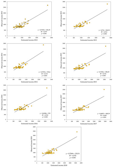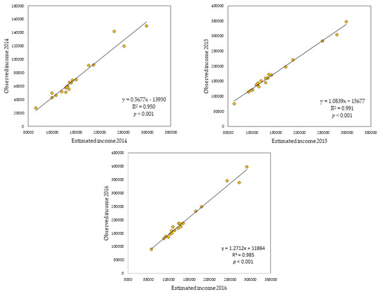 In the case of the Hungarian cities, the regression analyses highlighted a stable and strong relationship between the observed income and the estimated income (R2 > 0.95) for each year during the 2014–2016 period (Figure 6 and Table 3).