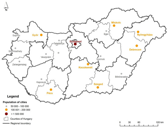 Hungary is divided into eight regions (NUTS-2), 19 counties and capital city—Budapest (NUTS-3) and 3155 LAU2 (local administrative units: settlements). In the present study, we have selected 19 municipalities and cities with a population of more than 50,000 inhabitants (Figure 5 and Appendix C). The largest cities from Hungary with a population exceeding 100,000 inhabitants are the capital city—Budapest (1,693,051 inhabitants), Debrecen (203,493 inhabitants), Szeged (163,763 inhabitants), Miskolc (160,325 inhabitants), Pécs (149,030 inhabitants), Győr (124,743 inhabitants), Nyiregyháza (120,086 inhabitants), and Kecskemét (110,974 inhabitants) [61].