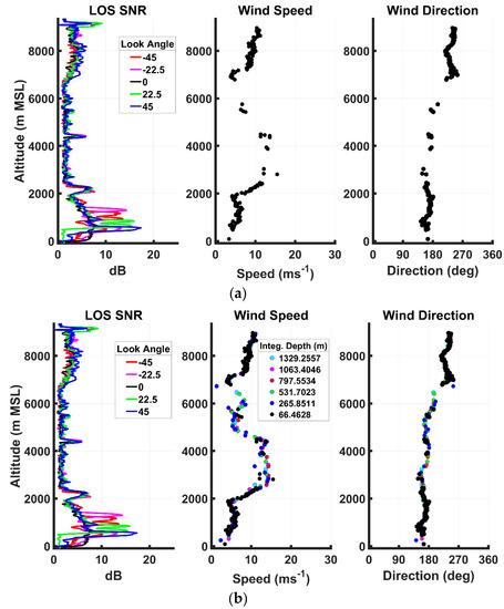 The range-gated LOS velocities processed along each look or perspective as described in Section 3.2 and Section 3.2.1 are inputted into the non-linear Levenberg–Marquardt (LM) damped least-squares algorithm to solve for u and v within each scan and are comprised of representative averages taken over 2 or 5 stares and over the distance and time it takes to complete the full scan while flying at ~225 m/s. It should also be noted that the LOS samples that go into the solver cover areas of the order of square kilometers and with the average vertical motion (w) assumed to be zero in the solver. These resultant base profiles provide, aerosols permitting, a wind vector every ~33 m in the vertical for 38 m sliding range gates.