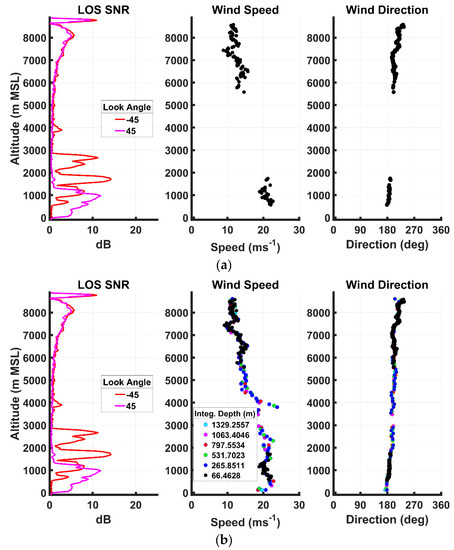 DAWN base vertical profiles of SNR, wind speed and wind direction processed with a single range gate (a) and adaptive integration over 5 integration depths (b) for the stronger wind case of 20 June 2017 204218Z.