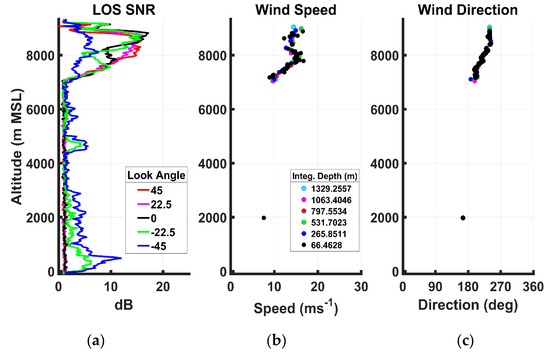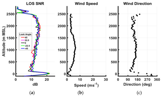 DAWN profiles of SNR (a), wind speed (b) and wind direction (c) on 1 June 2017 at 171233Z over the Florida peninsula.