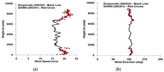 DAWN-dropsonde comparison of wind speed (a) and wind direction (b) for a convectively active case on 21 June 2017 ~200400Z.