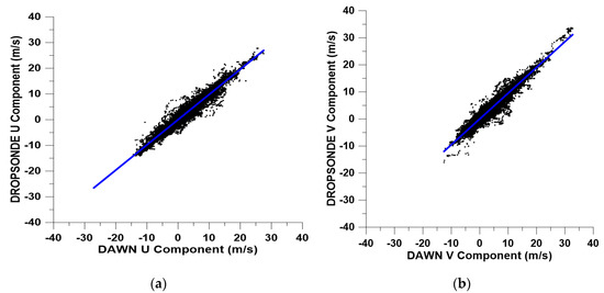 Statistical comparisons were made for the u- and v-components of the horizontal wind. Figure 10 shows the u and v scatter plots for the comparisons between the dropsondes and DAWN for the entire mission. Outliers of greater than 8 m/s difference (less than 1.0% of the total), attributable to one or two of the DAWN observations used in compiling the three-point running average passing the GOF test but providing a “noise” data point, were screened out. Statistics for the u and v component comparison for the entire campaign were also broken down into height (Table 7 and Table 8) and speed (Table 9 and Table 10) sub-categories. In these tables, the comparisons are done for DAWN—dropsondes where mean ∆z is the mean absolute height difference between the DAWN and dropsondes observation being compared, the bias is the mean difference of the DAWN and dropsonde component wind speeds (∆u, ∆v), and the root mean square difference (RMSD) is basically the standard deviation of the differences.