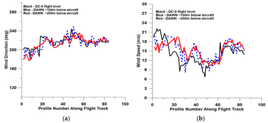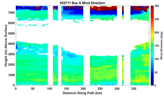 On 11 June 2017, the DC-8 and DAWN were flown to investigate both the inflow and active convection of an organized convective system in the central GoM. Figure 23 shows the flight track, location of individual DAWN profiles, and instantaneous satellite imagery over the central GoM on this day. During this mission, DAWN profiles were attempted and obtained below the flight level of 9–9.5 km with a horizontal resolution of 8–10 km. Figure 24, Figure 25 and Figure 26 show the wind profiles obtained in the southern inflow region of the convection moving west to east from relatively undisturbed to the increased cloudiness and active convection. Full profiles up to 9 km were obtained in the clearer inflow region and illustrate the sheared low-level flow. As the DC-8 moved into the active convection, although clouds prevented measurements in the lower portions of the column, important measurements were also obtained between 7 and 9 km. These profiles were also used by Turk et al. [12], who showed the positive impact of using DAWN winds together with winds obtained from the APR-2 in the convective regions for both analysis and numerical modeling.