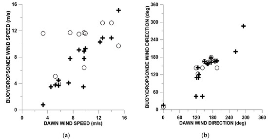 Scatterplot of DAWN-dropsonde comparison of wind speed (a) and wind direction (b) during CPEX.