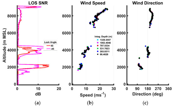 DAWN vertical profiles of SNR (a), wind speed (b) and wind direction (c) in inflow region of convection at 182117Z on 11 June 2017.
