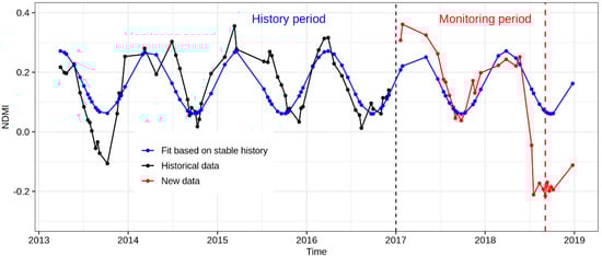 An example of how Breaks For Additive Season and Trend monitor (BFASTmonitor) uses historical data in the time series to identify abnormal changes in the monitoring period. Regression models estimated from the historical observations are used to predict the values of the new observations in the monitoring period. An abnormal change is signalled if the new observations are statistically different from the predicted values and the magnitude of change is negative. The vertical black dashed line represents the start of the monitoring period, whereas the vertical red dashed line indicates an abnormal change detected by BFASTmonitor. (BFAST package [14]). Here the observations are for normalised difference moisture index (NDMI) derived from Tier 1 Landsat-7/ETM+ and Landsat-8/OLI surface reflectance products.