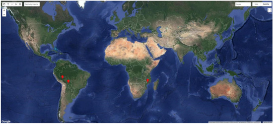 We evaluated our GEE BFASTmonitor implementation by comparing its forest disturbance detection performance to that of the original BFASTmonitor [14]. Here, we defined forest disturbance as an abnormal change in the time series with a negative magnitude of change over a forested area. The evaluation was conducted at three forest sites (Table 1), located in Peru, Bolivia and Mozambique (Figure 2). The site in Peru is a humid tropical forest located in Madre de Dios province, south-eastern Peru. This site is part of the Tropical Andes biodiversity hotspot [32], but has been experiencing rapid forest change because of the cropland expansion and gold mining [33,34]. The forest at the Peruvian site does not have defined seasonal variability in its photosynthetic activity and canopy water content (Figure 1). In contrast, the site in Bolivia is a dry tropical forest, with a moderate seasonality in its photosynthetic activity and canopy water content (Figure 3b). The Bolivian site is located in the south east of Santa Cruz. Forest disturbances at this Bolivian site are generally large, caused by clearance of forest to establish large-scale agriculture [10]. Unlike the other two sites, the Mozambican site is a Miombo woodland, with strong seasonal variations in the photosynthetic activity and canopy water content (Figure 3c). At this site, forest disturbance is dominated by small-scale disturbances caused mainly by smallholder farmers. The Mozambican site is located in one of the frequently burned areas in southern Africa. We chose these three study sites because they cover a variety of tropical forest types. They also have varying forest disturbance types caused by different agents. These sites are therefore appropriate for an elaborate assessment of the GEE BFASTmonitor performance under varying conditions.
