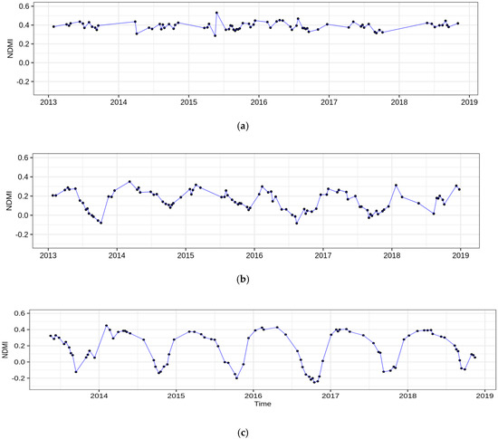 An example of Landsat pixel-time series for normalised difference moisture index (NDMI) of a (a) humid (Peruvian site), (b) dry (Bolivian site) tropical forest site and (c) miombo woodland (Mozambican site). The time series are for undisturbed pixels.