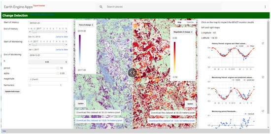 Our easy-to-use GEE web application (TerraSift) with a simplified user-interface (Figure 4) make GEE BFASTmonitor accessible to non-technical users. TerraSift change detection is powered by the GEE BFASTmonitor and is currently accessible via: https://andreim.users.earthengine.app/view/bfastmonitor. The users can adjust BFASTmonitor parameters (i.e., start and end dates for the history and monitoring period, the h-parameter, number of harmonic terms to fit, the alpha and the period). Additionally, users can inspect the time series for a specific pixel by clicking on the map. TerraSift generates two raster layers (date and magnitude of change) and these layers can also be downloaded for further processing or restyling. With TerraSift, the state-of-the-art satellite imagery-based change detection is available for a broader public. Advanced users who may wish to integrate BFASTmonitor algorithm in their GEE processing chains, can use the GEE BFASTmonitor package (https://github.com/bfast2/geeMonitor).