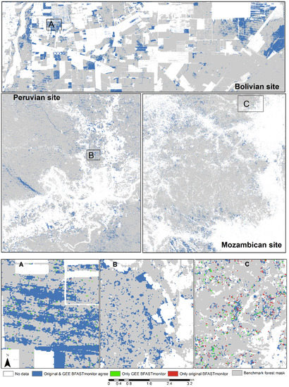 Spatial agreement and disagreement between BFASTmonitor and GEE BFASTmonitor on forest disturbance in the Landsat NDMI time series at (A)dry (Bolivian site) and (B) humid (Peruvian site) tropical forest and (C) Miombo woodland (Mozambican site).
