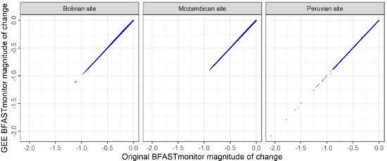 There was a strong positive correlation (r = 1) in the magnitude of change between original and GEE BFASTmonitor for pixels where both implementations agreed spatially and temporally at each study site (Figure 6). This strong correlation indicates that the magnitude of change was largely similar for pixels where both implementations agree temporally on the time of forest disturbance.